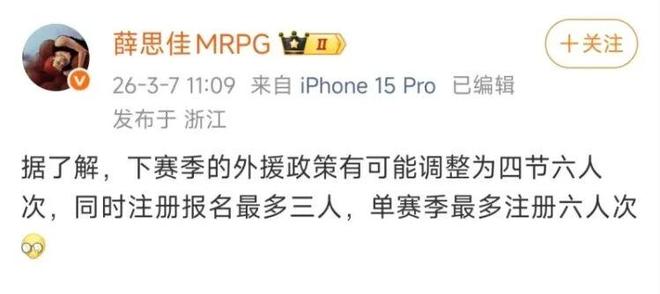 据媒体人“球圈赵探长”和上海男篮跟队记者薛思佳透露,在CBA全明星周末期间的投资人大会上,对下个赛季的外援政策、工资帽、国内球员合同方面进行了调整。外援政策方面,由目前每支球队能够同时注册4名外援调整为3名外援;将赛季最多注册8人次调整为赛季最多注册6人次。外援工资帽上,分为三档阶梯向下浮动。具体方案为:如球队打到常规赛,工资帽为400万美元;如球队打到八进四及十二进八,工资帽上浮为450万美元;如球队打到总决赛及半决赛,工资帽继续上浮为500万美元。