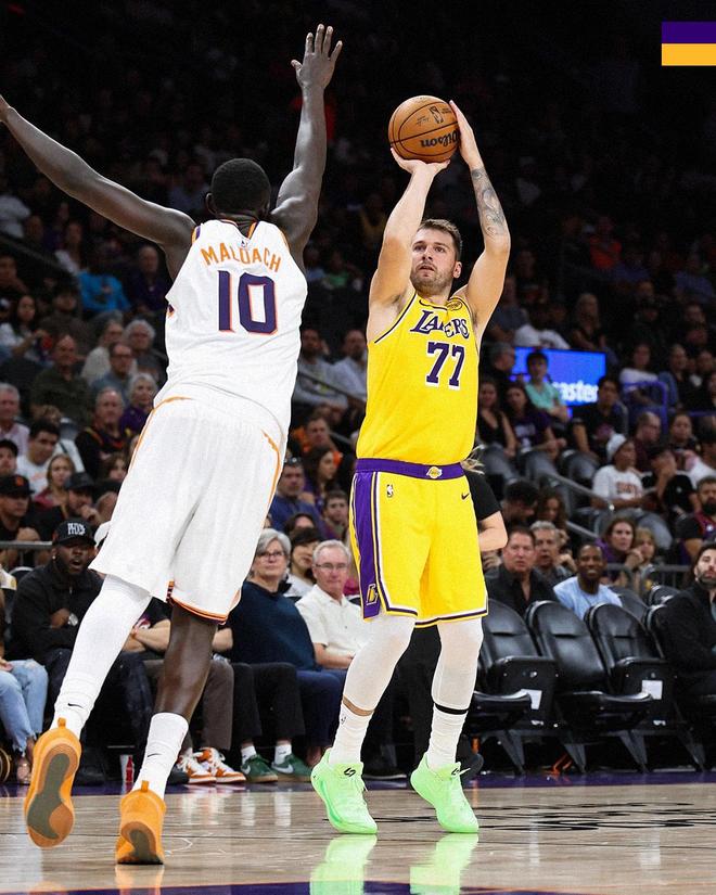 由于今夏带领斯洛文尼亚男篮参加欧锦赛,东契奇连续缺席了三次季前赛,今日湖人客场对阵太阳,詹姆斯因坐骨神经痛继续休战,东契奇正式复出,与里夫斯、斯马特、艾顿和拉拉维亚一起首发出战。
